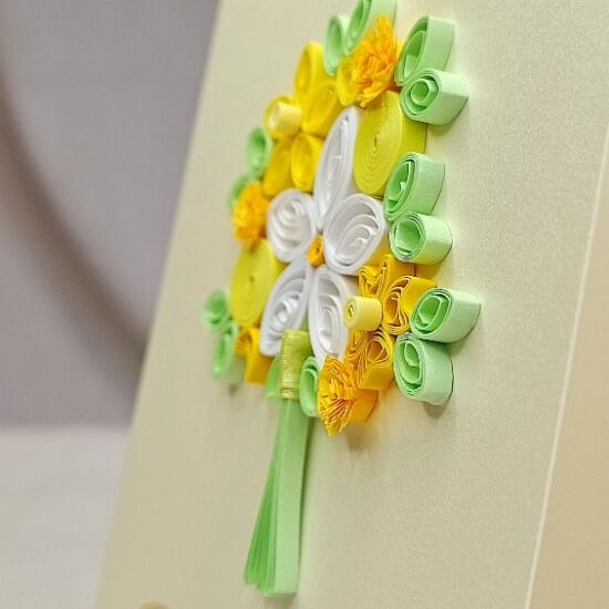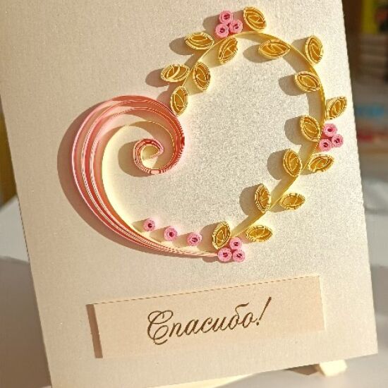Эта открытка – результат кропотливой работы в технике квилинг (бумагокручение). Каждый элемент я вручную скручиваю из узких бумажных лент, придаю ему форму и собираю в единую композицию, как пазл.