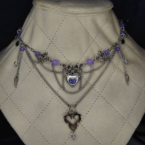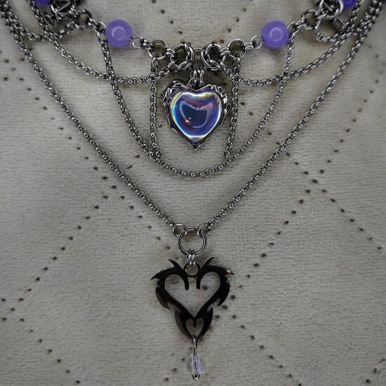 Центральный элемент — иридисцентное стекло в декоративной оправе, ниже — акцентный сердечный кулон из стали.