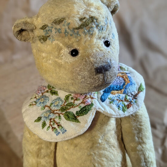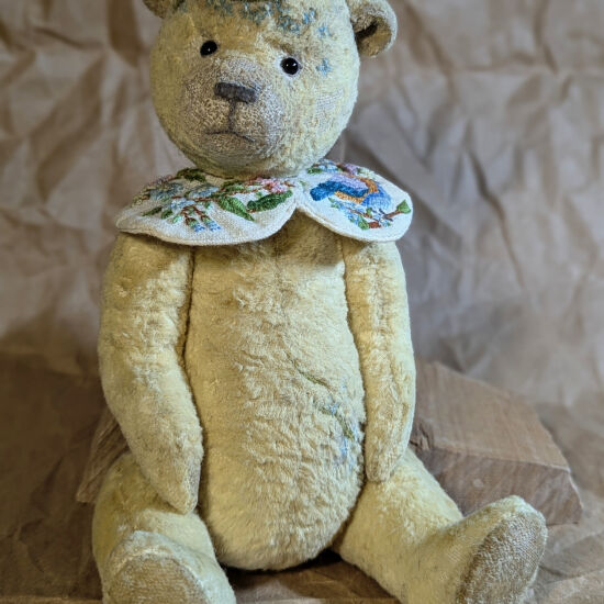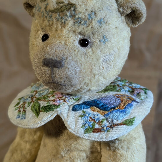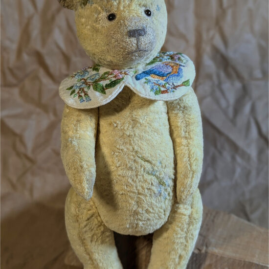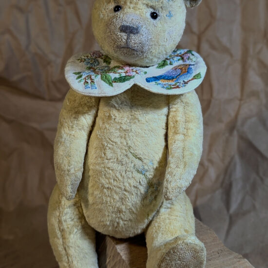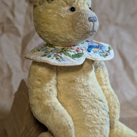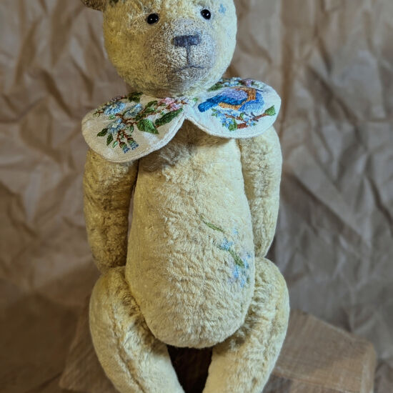 Лапы и голова подвижные, внутри 5 шплинтованных креплений. Серафима не стоит самостоятельно и нуждается в поддержке. На лобике и животике ручная вышивка. Воротник сшит и расшит мной; из хлопка.
