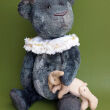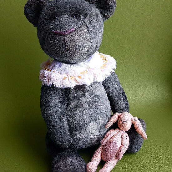 Лапы и голова подвижные, внутри 5 шплинтованных креплений. Винни не стоит самостоятельно и нуждается в поддержке. Воротник сшит и расшит пайетками и бисером мной; из хлопка. Игрушка-кролик сшит из хлопка и идет вместе с ним.