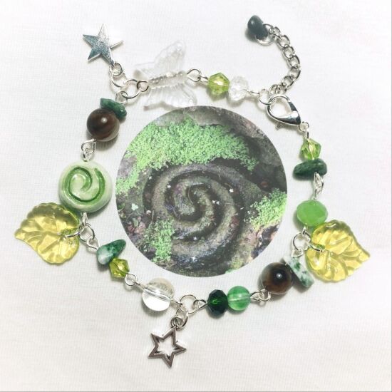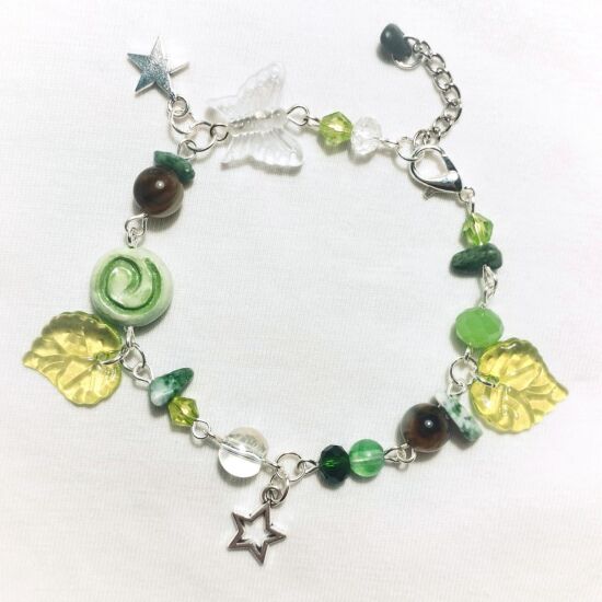 Блестящий браслетик с листиками и камушками древесного агата поможет дополнить ваш образ! Завитушка на браслетике сделана из глины. Также на браслете присутствует цепочка для регулирования размера