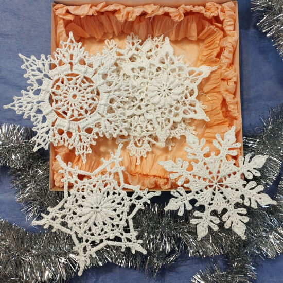 Может использоваться в качестве Рождественского и Новогоднего декора. Снежинки упакованы в подарочную коробку.