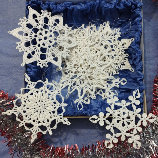 Может использоваться как Рождественский и Новогодний декор. Снежинки упакованы в подарочную коробку.