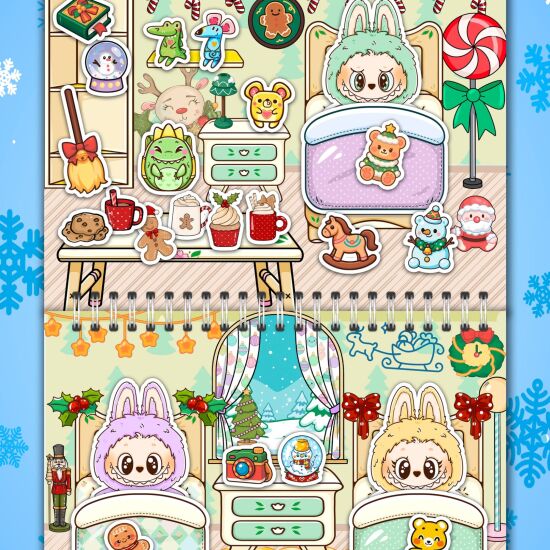 Лабубу собирает друзей на самую уютную вечеринку года: снежные танцы, смех до слёз и подарки, которые прилипают к сердцу так же крепко, как липучки к страницам.