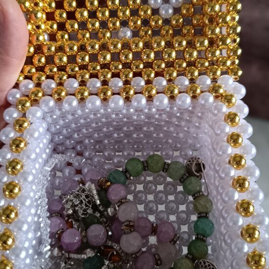 Очень красивая шкатулка из бусин станет украшением вашей комнаты. Удобная и вместительная. Внешний размер 11,5*11,5 см. Внутренний размер 8*8 см. Выполнена из жемчужных и золотых бусин. Ручная работа
