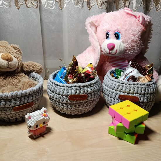 Корзинки из трикотажной пряжи украсят интерьер и создадут уют и порядок.