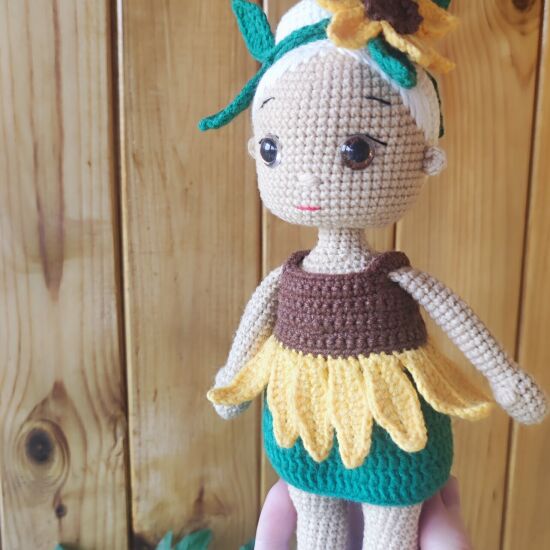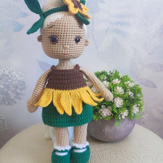 Куколка в стиле "Подсолнух" связана из полу хлопковой пряжи. Рост 24 см. Голова поворачивается. Одежда снимается.