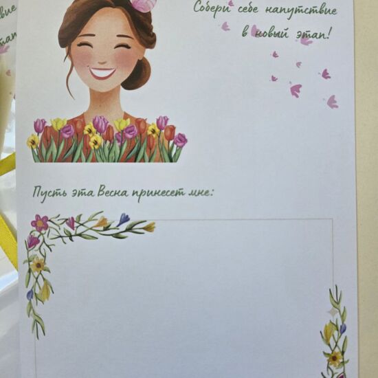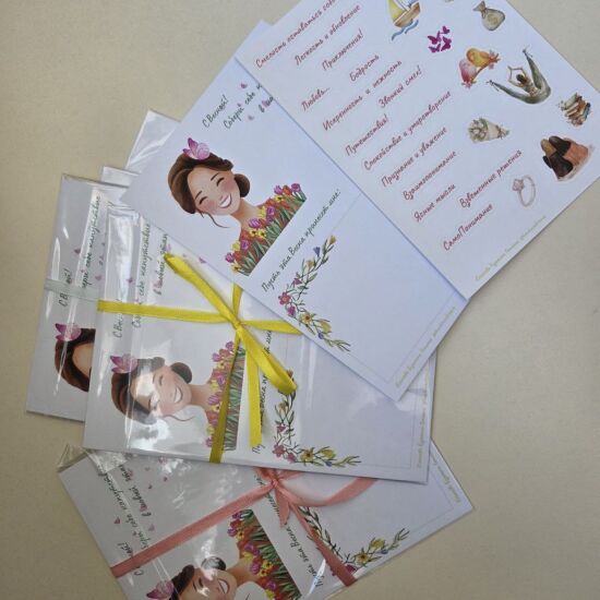 Открытка-конструктор состоит из бумажной открытки и стикерпака, из которого можно собрать себе пожелание или напутствие.