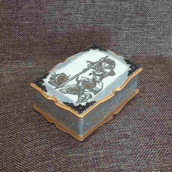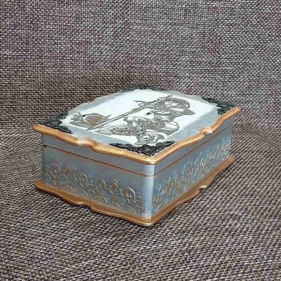Деревянная шкатулка на четыре отделения, с изображением девушки рыцаря. Предназначена для хранения ювелирных изделий и драгоценностей. Может быть прекрасным подарком на особые случаи.